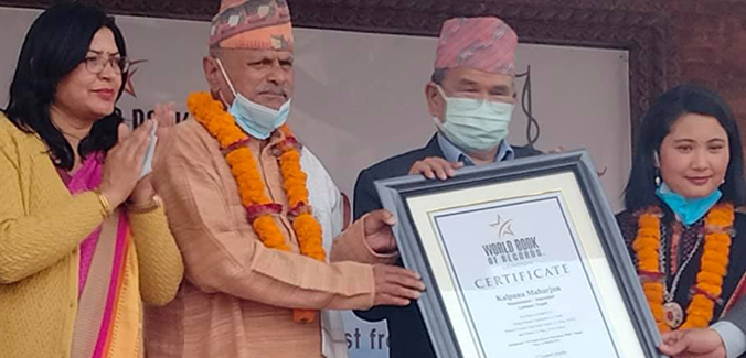 सगरमाथा आरोही कल्पना महर्जनलाई बुधवार ललितपुर महानगरपालिकाले नगर प्रमुख चिरिबाबु महर्जनको सभापतित्वमा आयोजित कार्यक्रममा प्रमुख अतिथि सङ्घीय गणतन्त्र नेपालका प्रथम राष्ट्रपति डा. रामवरण यादव र वर्ल्ड बुक अफ नेपालका अध्यक्ष सागर कटवालले संयुक्त रूपमा विश्व कीर्तिमानको प्रमाणपत्र हस्तान्तरण गरेका थिए ।